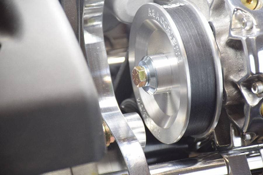 The A&A Secondary Drive is unique in that it does NOT drive the accessories via the air conditioning belt like other systems. The accessory drive shaft pulley is driven by its own dedicated belt. This allows full belt wrap around the crankshaft pulley as well as the accessory drive shaft pulley and the ability to tension this belt separately. This eliminates accessory belt slip that plagues other systems. Our system also utilizes a spring tensioner on the alternator/power steering belt which allows proper belt wrap and tension.