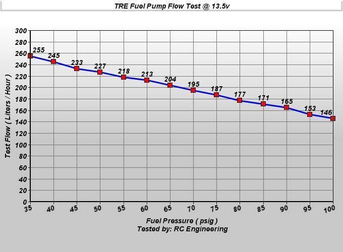TREperformance has been manufacturing our own 255 LPH fuel pumps for over 10 years. Do not be fooled by other companies who claim to have tested their pumps, we have sold over 100,000 of these fuel pumps and have had the flow tested by RC Engineering to verify the output. TRE fuel pumps flow very similar to Walbro pumps but they DO NOT have the loud, annoying whine of Walbro pumps, and TREperformance fuel pumps are nearly silent when the vehicle is running. This makes our 255lph and 210lph pumps perfect for performance cars up to 600hp, but can also be used as stock replacement pumps.