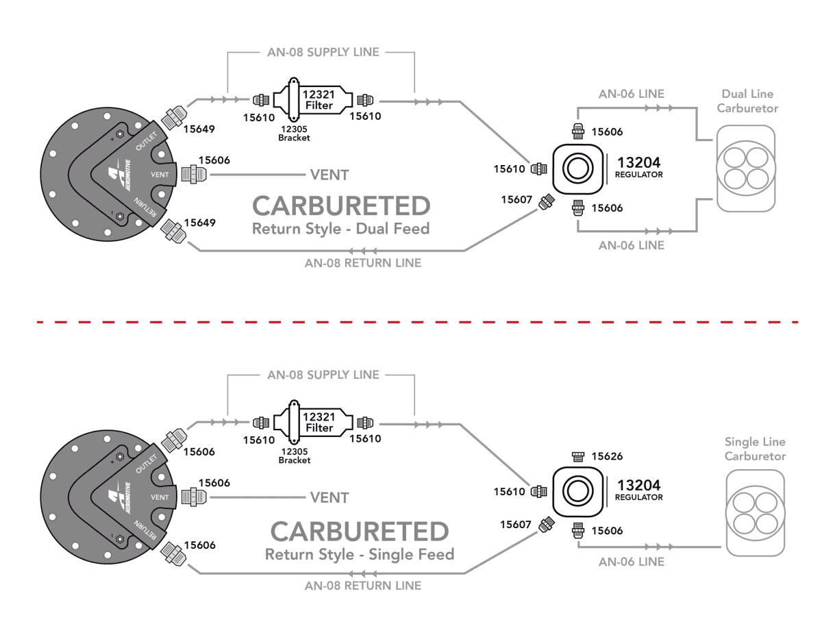 These new Phantom Carbureted Fuel Systems include all main fuel system components required to create a proper carbureted fuel system, including the desired Phantom Baffled Fuel Pump Kit with a 340 LPH fuel pump. Each system ships with the proper carbureted bypass fuel pressure regulator, high flow billet fuel filter, filter mounting bracket, plus all the required port fittings and o-rings, the deluxe wiring kit (not shown) and Aeromotive fuel pressure gauge. This product is not legal for sale or use on emission-controlled vehicles except when used as a direct replacement part matching OEM specifications.
