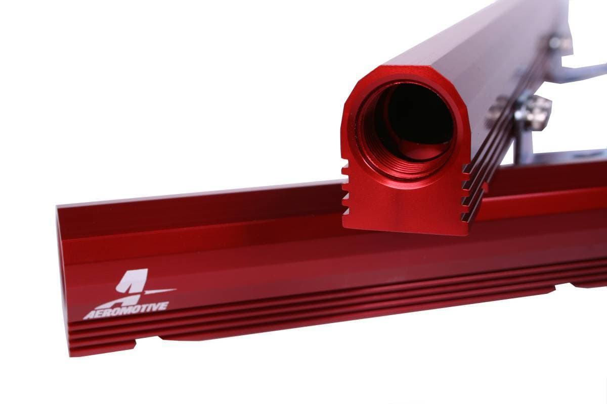 Aeromotive High Flow, Billet Fuel Rails combine 3,000 HP flow capabilities with bolt-on ease of installation. GM 1997-2004 LS1 & 2001-2005 LS6 Rails Only. ORB-08 Ports with compact connections and positive, leak-free sealing. Full 5/8' ID through bore, capable of supporting up to 3,000 HP. Fully compatible with -10 AN line if combined with custom ORB-08/AN-10 adapter P/N 15641. Full size ports at each end for optimal injector supply and minimal hydraulic fluctuation. Additional inlet/outlet ports are provided where required for plumbing convenience. CNC-machined, billet aluminum construction for unequaled fit and finish. Steel mounting brackets, custom engineered for each application, combining a solid, durable mounting platform with correct fit and bolt-on ease of installation. Red, Type II bright dip anodized finish that looks great and protects against corrosion.