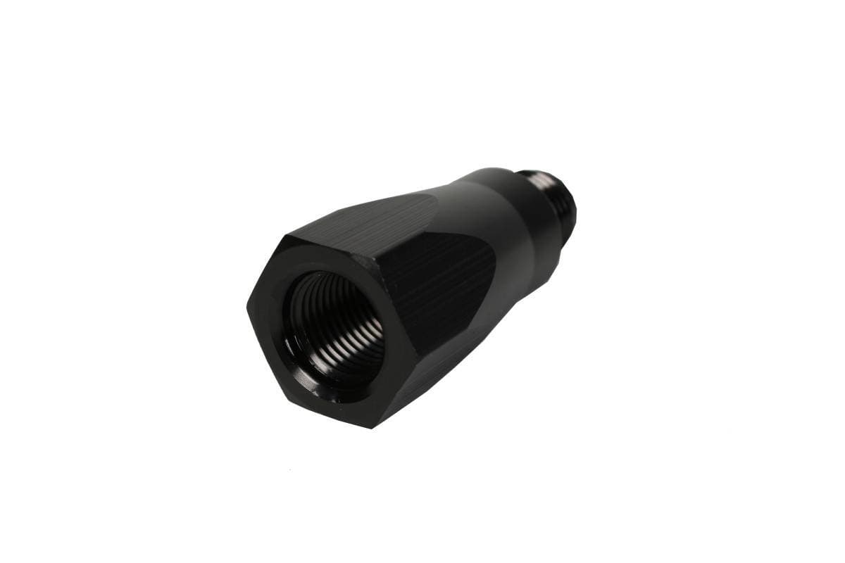 High flow one-way check valves designed to prevent back-flow with minimal pressure drop. Ideal to prevent drain back after the fuel pump is turned off, or when dual pumps are used and both pumps may not run simultaneously. CNC-machined billet aluminum and Type II bright dip black anodized finish. AN-06 male inlet, ORB-06 female outlet connections. Ideal configuration for easy installation into filter or fuel pump outlet port, no need for additional lines, hose-ends or fittings. Suitable for use with gasoline fuels only, not alcohol compatible. Use AN-06 o-rings P/N 15621 for installation into ORB-06 port.