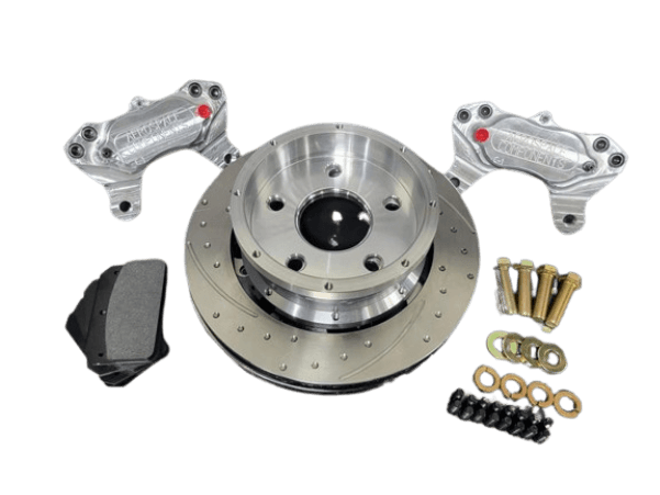 This 5 lug front pro-street disc brake kit includes Billet Aluminum Direct Bolt on 4 Piston Vented Rotor Calipers, Grade 8 Hardware, Billet Aluminum Hats, Bearings, Seals, Hawk Performance Brake Pads, 11 3/4 Diameter, 13/16 Thick Drilled Rotors Drilled and Slotted Rotors, Retains Stock Sealed Bearing Hub Assembly and ABS sensors.