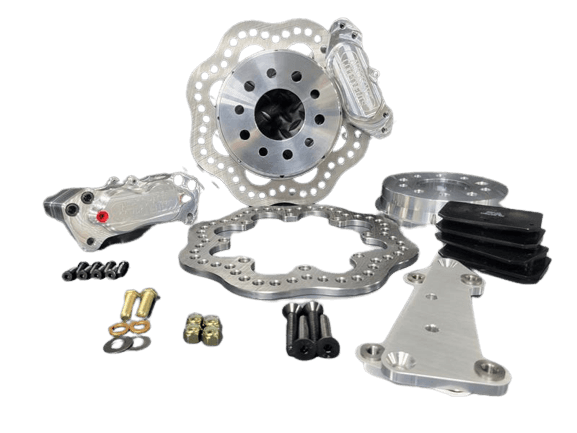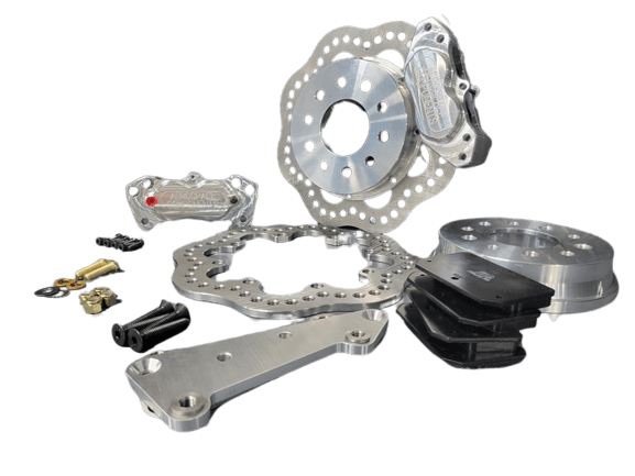 This kit will drastically reduce the weight of your brakes and are worth at least 1/10 in the quarter, but are strictly for drag racing use because the rotors are not vented and will warp under street driving use. If you need brakes for street use, take a look at our Aerospace street brakes for your vehicle. These are the heavy duty brakes which Aerospace recommends for cars weighing 2,600 - 3,000 lbs.