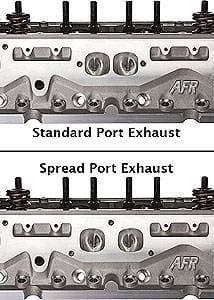 Spread port heads have the center exhaust ports spread apart approximately 1/2" over stock GM heads. The reason for spread port heads is to achieve additional cooling in the center of the head where the heat concentration is greatest. As standard headers do not fit, spread port headers are required since the center ports are spread further apart than stock GM products. The increased spacing on the exhaust port also requires the use of exhaust gasket Fel-Pro #1409. Spread port heads only come with a Stahl bolt pattern. AFR's spread port head has all the benefits and features of AFR's standard head. As all benefits and features are the same, please review respective page for product details (i.e. for 210cc spread port view 210cc SBC "Eliminator").