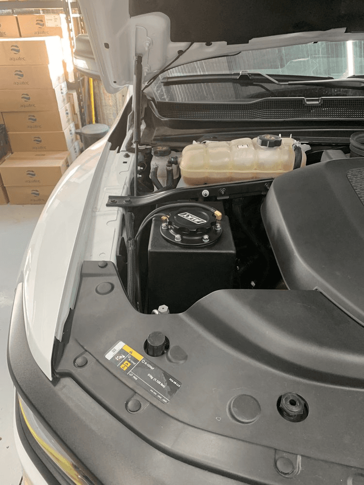 This is a Kit made for 2021+ 6.2 Ram 1500 TRX. Underhood kit utilizes a 2 gallon fuel cell with a billet cap as the methanol tank using a 90 micron in-line filter. Includes a progressive controller, braided lines, LED Panel for windshield, high pressure check valve, all AN lines, all necessary wiring and loom and your option of M10/M15 Single Nozzles or an upgraded Dual Nozzle setup.