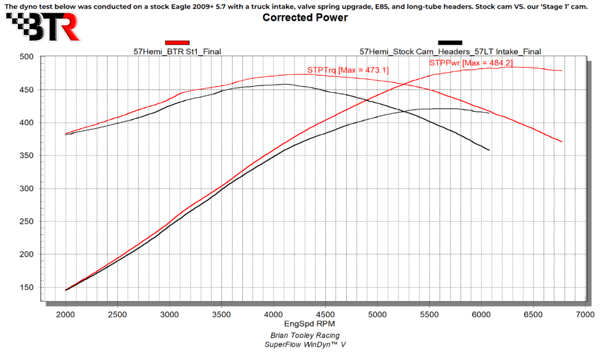 480+ HP at the crank of your 5.7L Hemi is what you can expect with our ‘Stage 1’ camshaft. This ‘Stage 1’ grind provides an additional 1000 RPM of usable operating range while maintaining drivability. On the BTR Dyno, we observed gains over the factory cam everywhere above the 2000 RPM start point. At 6000 RPM, there was a gain of 65 HP and 58 lb/ft. The ‘Stage 1’ continues to pull strong to 6500 RPM!