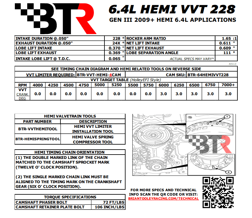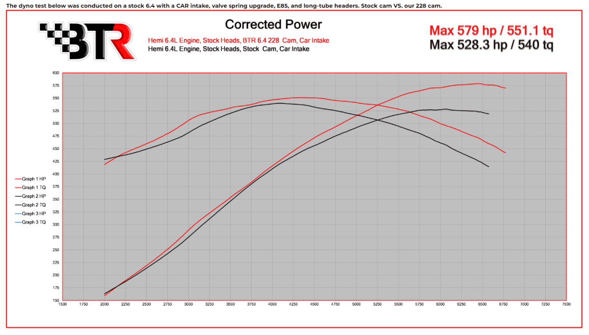580+ HP at the crank of your 6.4L Hemi is what you can expect with our 228 camshaft. The 228 grind provides additional horsepower and torque throughout the entire operating range while delivering an aggressive idle quality . On the BTR Superflow engine Dyno, we observed gains starting at 2400 RPM, with a peak gain of 50+ HP at 6500 rpm and 46 lb/ft at 6400 RPM. The 228 continues to pull strong up to 7000 RPM!