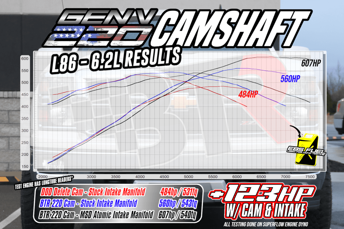 BTR’s 220 cam is the largest recommended option for L83 engines, delivering over 500 hp with basic bolt-ons while retaining factory VVT for strong low-end torque and explosive top-end power. It requires a DOD delete and piston fly-cutting on 5.3L applications, but offers significant gains across the entire powerband. In L86 truck applications, the BTR Gen V 220 cam delivers strong low- and mid-range torque with impressive power to redline. Ideal for work, light towing, or weekend cruising, it offers well-rounded performance with a noticeable, attention-grabbing idle. For LT1 applications, the Gen V 220 cam delivers over 600 hp while maintaining smooth power, drivability, and excellent top-end performance—perfect for both daily use and weekend fun.