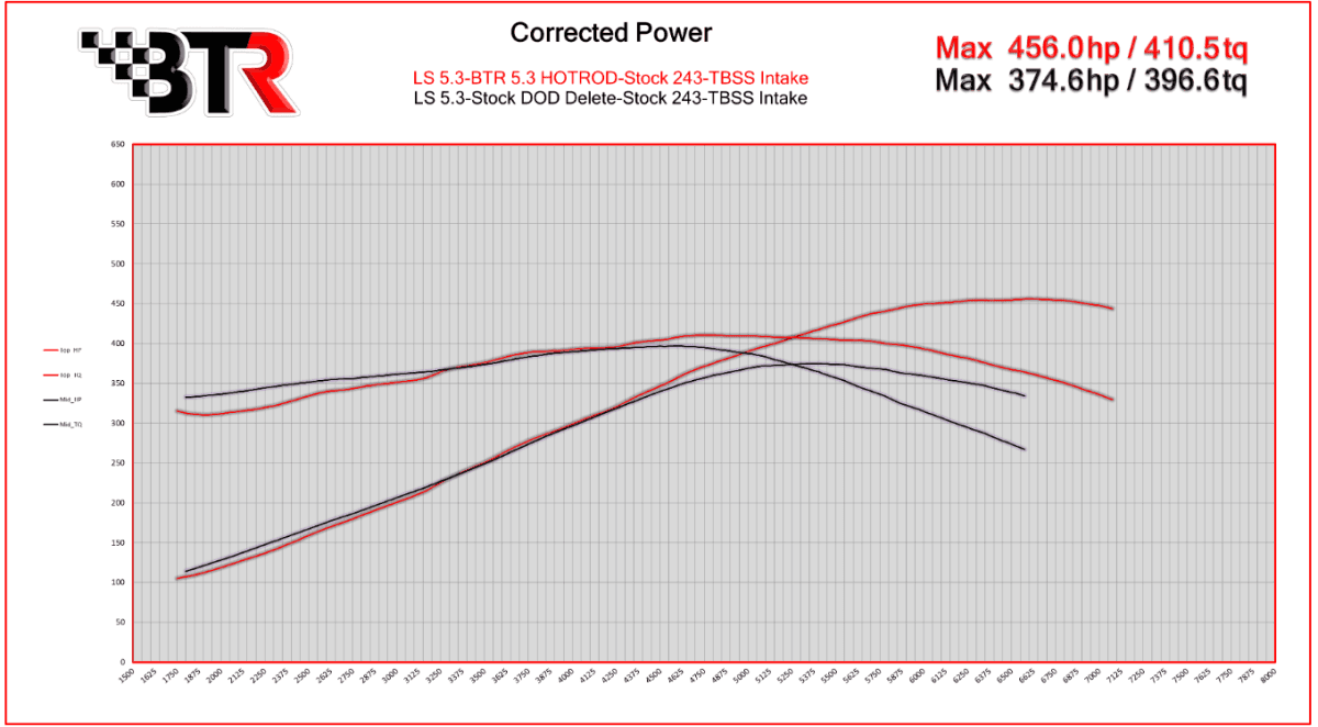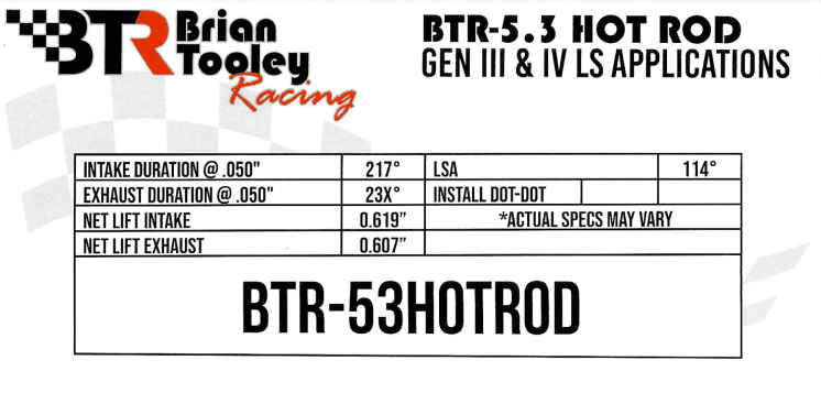 BTR's Hot Rod cam delivers an aggresive idle while maintaining good street manners. It makes slightly less torque down low than our Truck Norris cam yet produces an additional 20+ HP at peak. These newly designed BTR lobes were developed in house and tested on our Spintron and Engine Dyno to achieve the highest overall power curve while also maintaining our strict valvetrain stability and durability standards.