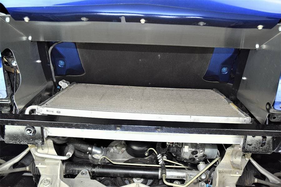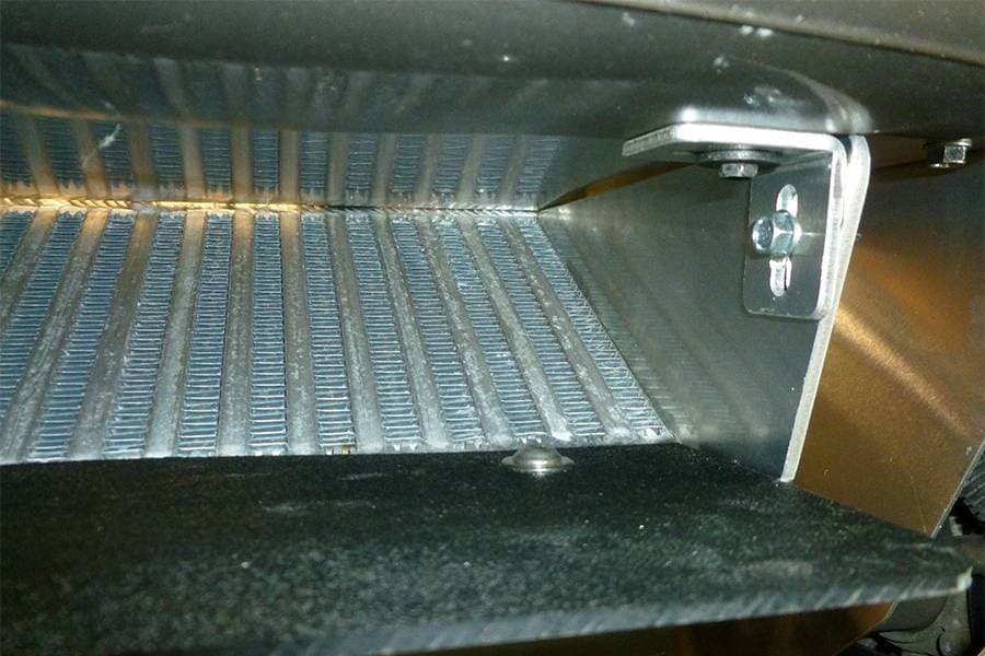 A&A's intercooler works in conjunction with a complete radiator cavity enclosure. It has aluminum side panels that seal up against this aluminum enclosure and a replaceable ABS plastic duckbill to grab air and force it up into the intercooler core.