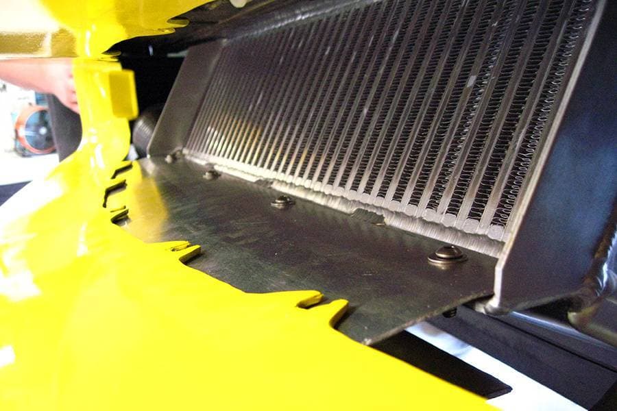The side skirts welded to the intercooler capture frontal airflow and act as mounting brackets. The top seam is sealed by the frame and the bottom seam is sealed to the front fascia with a lower panel. (Included) These all work together to enhance airflow through the intercooler core.