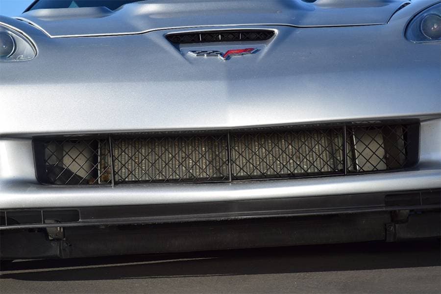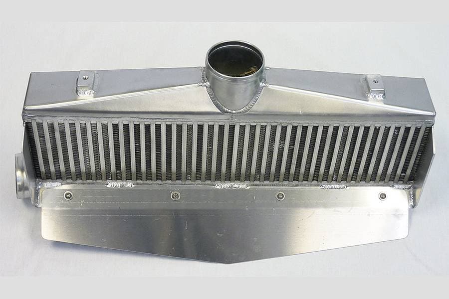The full width intercooler is situated with the upper tank hidden behind the frame while the lower tank is nestled inside the front fascia. Only the core is visible through the grill opening. Besides the obvious advantage of better cooling, it is by far the best-looking setup out there.