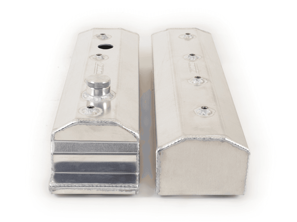 Tall fabricated aluminum valve covers for small block Chevy come filler plug and pcv port on the right cover