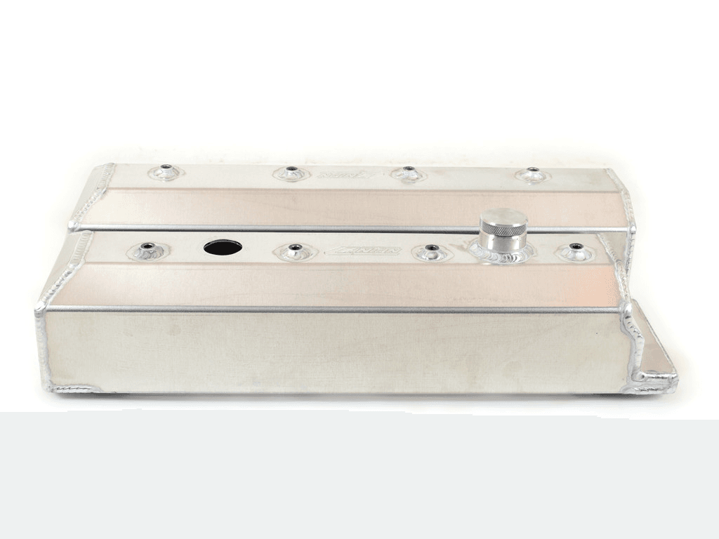 This SBC F-body style tall fabbed aluminum valve cover comes with filler plug and pcv port on the right cover. This fabricated valve cover is designed to be light weight, yet strong enough to prevent warpage. It is constructed from .100" aluminum, with heavy wall mounting tubes and is welded on cylinder heads to a insure proper fit. Fill bungs, AN fittings, or breather stacks can be installed on a special order basis. Stainless socket head mounting bolts included.