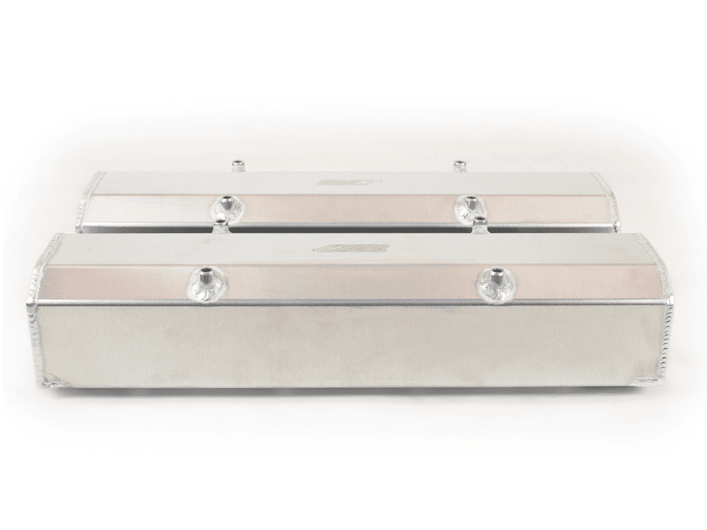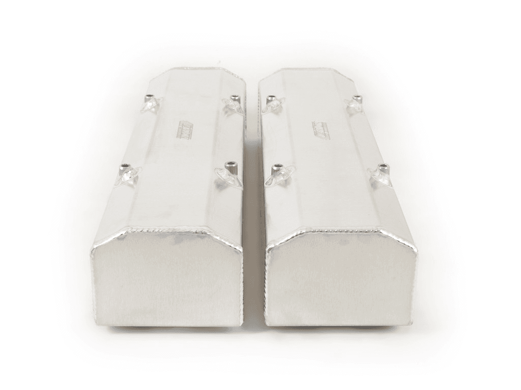 This SBC tall fabbed aluminum valve cover comes plain, with no holes. This fabricated valve cover is designed to be light weight, yet strong enough to prevent warpage. It is constructed from .100" aluminum, with heavy wall mounting tubes and is welded on cylinder heads to a insure proper fit. Fill bungs, AN fittings, or breather stacks can be installed on a special order basis. Stainless socket head mounting bolts included.