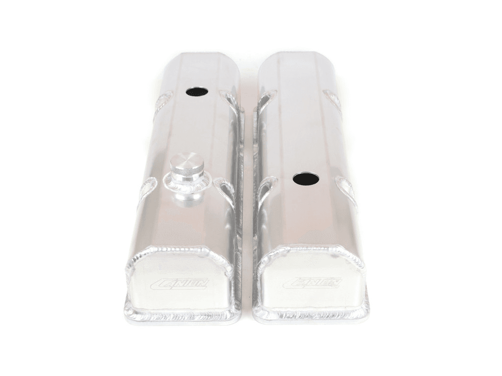 Canton Racing's laser cut rail valve covers are perfect for all SBC motors that are looking for a strong reliable valve cover. These valve covers offer great performance while our unique looks give your motor an edge in appearance. These valve covers are designed to withstand the repeated installations and removals often necessary on race engines. These valve covers also include pvc port holes on each cover and a fill bung with billet cap on the front of one cover. The 5/16" laser cut rail provides an ideal mounting surface while the .100 aluminum fabricated upper keeps the cover ridged and light.