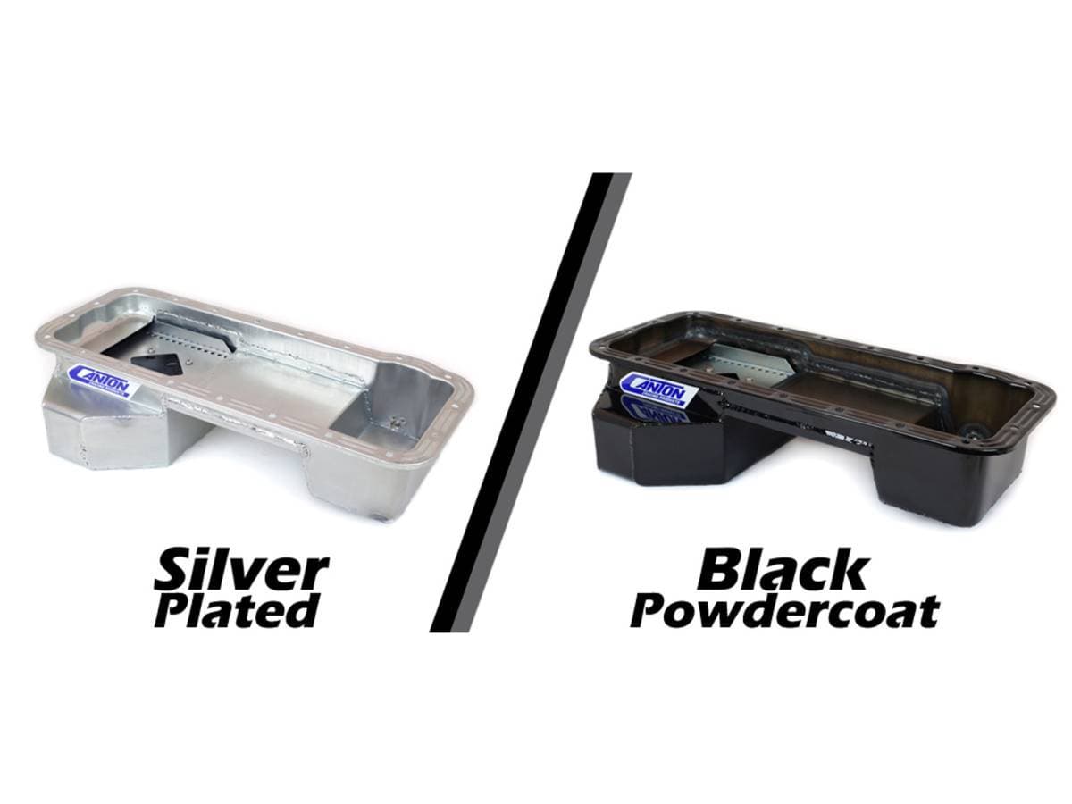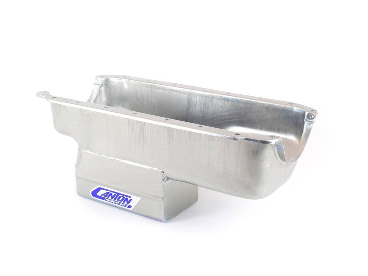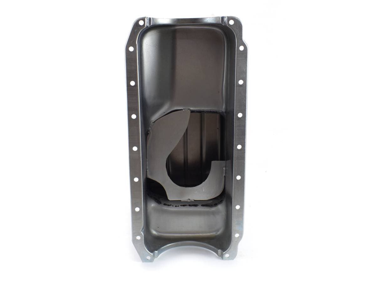 This street / strip oil pan for SM. Block Chrysler engines 273, 318, & 340, fits most production chassis. It features a deep sump and built in slosh baffle for oil control and a magnetic drain plug. Sump is 9" deep and provides a 7-quart system capacity.