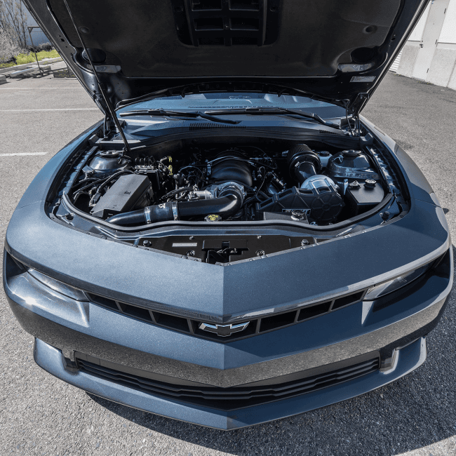 Each Camaro SS supercharger system is a comprehensive design and includes all necessary components to ensure safe, reliable operation. Standard-issue with each kit is a large, front-mount intercooler (3” inlet and outlet - 24x12x4” thick) to help ensure low intake air temperatures for optimal performance. All necessary aluminum tubing, silicone couplers, and clamps are also included for easy installation. Proper air/fuel ratios are ensured with the included Grams Performance 52lb/hr. fuel injectors, and an optional engine management system. Convenient, plug-and-play fuel injector adapters are also included, making each kit a true bolt-on experience.