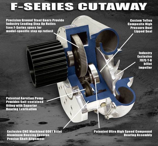 These kits also include a standard carb bonnet and the tubing required to boost your Holley 4150-style carburetor. The F-1 thru F-1R utilize an advanced helixed impeller capable of accommodating a broad range of applications. The F-1 flows enough air to feed 1050 hp while the F-1R will support up to 1,200 hp.