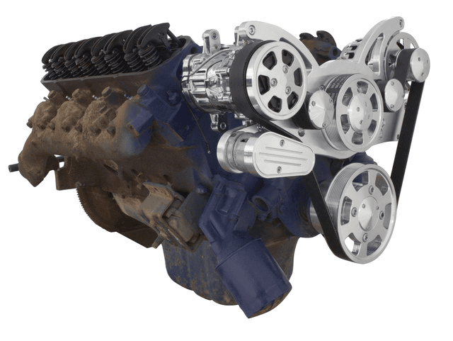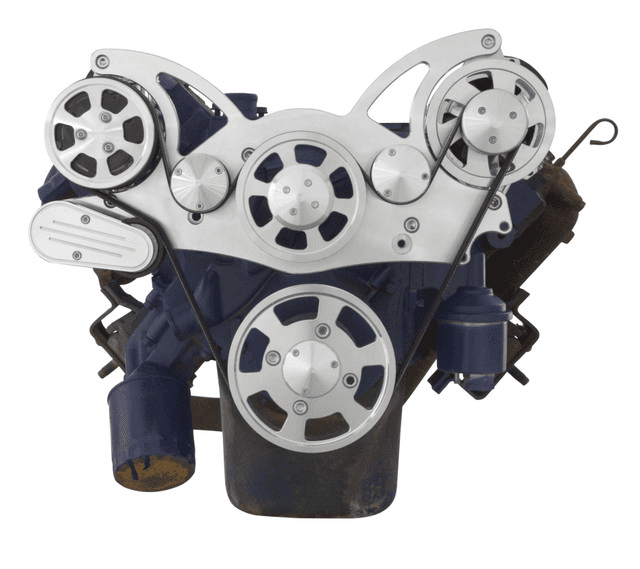 All Inclusive WRAPTOR™ 8 Track Serpentine System for Cadillac engines with 140 Amp alternator and Peanut Style AC compressor. CVF Racing's 8 Rib Serpentine pulleys increase grip, reduce stretching and prevent slippage compared to traditional 6 Rib designs. Spring loaded Gates tensioner ensures proper tension during hard acceleration and deceleration while compensating for belt stretch. Places alternator on the driver's side above the power steering pump.