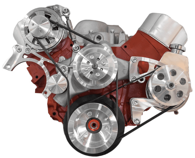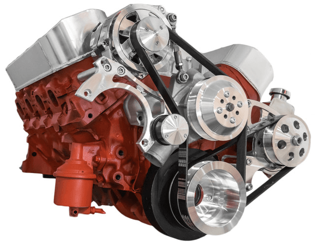 The BEAST 8 Track Serpentine System for Big Block Chevy engines with Air Conditioning, Power Steering and Alternator. Unique 8 Rib Serpentine pulley design increases grip, reduces stretching and prevents belt slippage when compared to traditional 6 Rib designs. Mounts Saginaw P Series Power Steering pump low on driver side and puts Peanut Style 7B10 AC Compressor with Alternator on the passenger side. Uses standard Chevy long water pump.