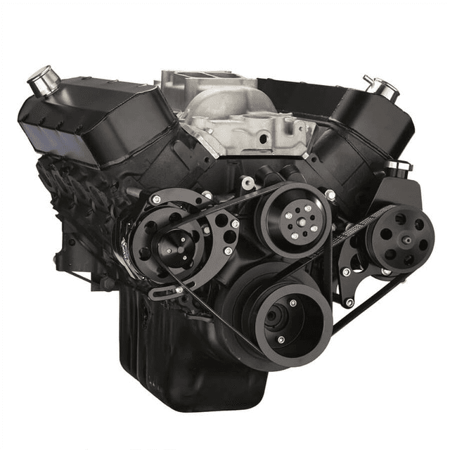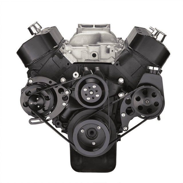 The BEAST 8 Track Serpentine System for Big Block Chevy engines with Power Steering and Alternator. Unique 8 Rib Serpentine pulley design increases grip, reduces stretching and prevents belt slippage when compared to traditional 6 Rib designs. Mounts Saginaw P Series Power Steering pump low on driver side and puts alternator on the passenger side in a mid-mount configuration. Uses standard Chevy long water pump.