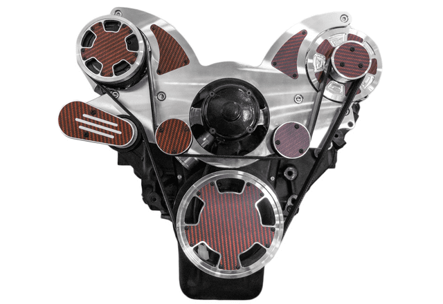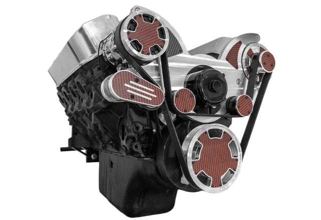 All Inclusive WRAPTOR 8 Track Serpentine System for Chevy Big Block engines with 140 Amp alternator and Peanut Style AC compressor. CVF Racing's 8 Rib Serpentine pulleys increase grip, reduce stretching and prevent slipping compared to traditional 6 Rib designs. Spring loaded Gates tensioner ensures proper tension during hard acceleration and deceleration while compensating for belt stretch. Places alternator on the driver's side above the power steering pump.