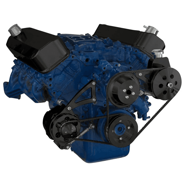 We manufacture and sell the highest quality V-belt system for Ford big block engines with alternator and power steering. Our brackets and pulleys are made from aircraft quality 6061-T6 billet aluminum and CNC machined to provide a perfect fit. Our Ford pulley and bracket systems are designed for heavy use while providing a clean, polished look on your engine. This system uses our exclusive low mount alternator bracket that puts the alternator down low by the oil pan in the factory location. This kit will provide increased power to the serpentine system and reduced slippage of your belts.