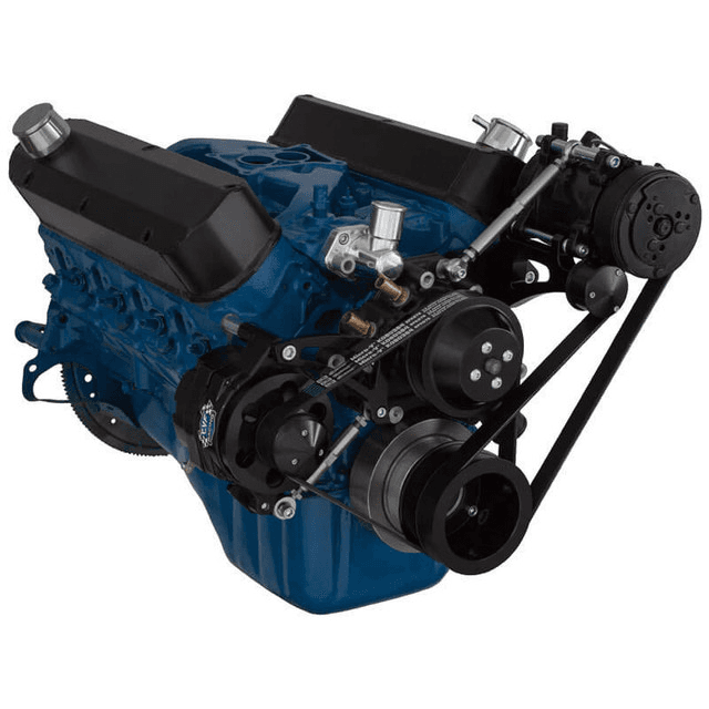 Requires either GM Saginaw keyway pump or ford power steering pump with steel reservoir (not the newer one with plastic reservoir)