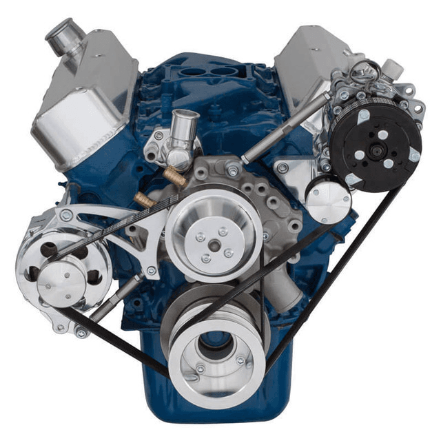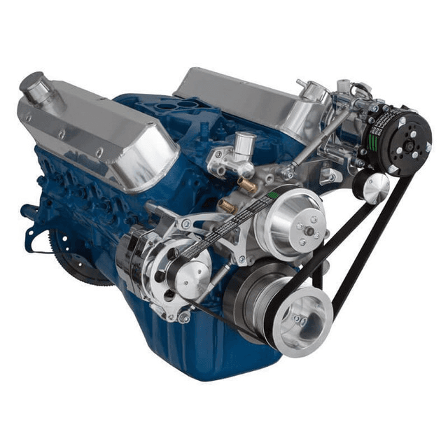 Requires either GM Saginaw keyway pump or ford power steering pump with steel reservoir (not the newer one with plastic reservoir)