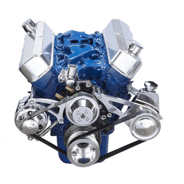 Requires either gm saginaw keyway pump or ford power steering pump with steel reservoir (not the newer one with plastic reservoir)