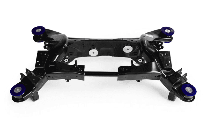 It is worth noting that most wheel hop related issues rarely cause an immediate failure, with certain exceptions. The result of repeated cycling torque spikes will often weaken the material of a given component such as an axle bar or stub shaft. Then each subsequent hit will continue to weaken the component until it fails completely. If you know that you have driven through a particularly abusing situation, it would be wise to pull the axles and assess the splines of the inner and outer stub shafts as a maintenance procedure. If they have started to twist or shift, then you might be able to prevent a more catastrophic failure. We encourage all end users to read up on the appropriate measures that they can take to help prevent wheel hop with their specific vehicle. This can be anything such as aftermarket bushings, shocks, springs, control arms, tire type, or excessively low tire pressure. Two of the most fundamental pieces we look at to help control rear end movement and prevent wheel hop start with the cradle and differential bushings. Both of these bushing sets are often very soft from the factory and although they provide smooth ride quality, they allow a considerable amount of movement in a performance scenario. Which can lead to a number of concerns or issues.