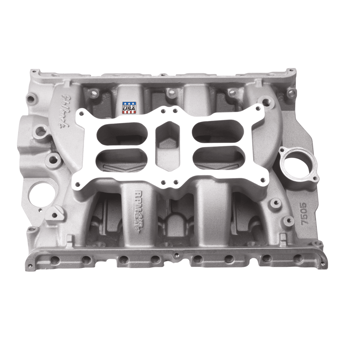 Edelbrock part #7505 RPM Air-Gap Dual-Quad FE #7505 intake manifold is designed for 1960-later high-performance's street 390-406-410-427-428 c.i.d. Ford FE engines with low/medium rise or Edelbrock Performer RPM FE heads #60059 or #60069. The manifold carb pad is setup to fit Edelbrock carburetors only, will not work with other square flange carburetors. In Dyno tests on a 390 with Performer RPM heads #60069, Performer RPM camshaft #7106 Thunder Series AVS #1803 and #1804 carburetors, it made 452 hp and 428 ft-lbs. torque. Will not fit 427 Ford Hi-Riser and Tunnel Port engines. Has machined boss for a breather flange at rear.
