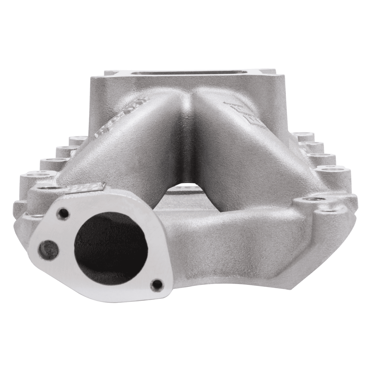 Port exit size at cylinder head is 1.08" x 1.90" with extra material to accommodate a 1.18" x 2.10" opening. The Edelbrock Victor Jr. #29215 EFI is a single-plane, high-rise intake designed for maximum race-winning power at higher engine speeds.
