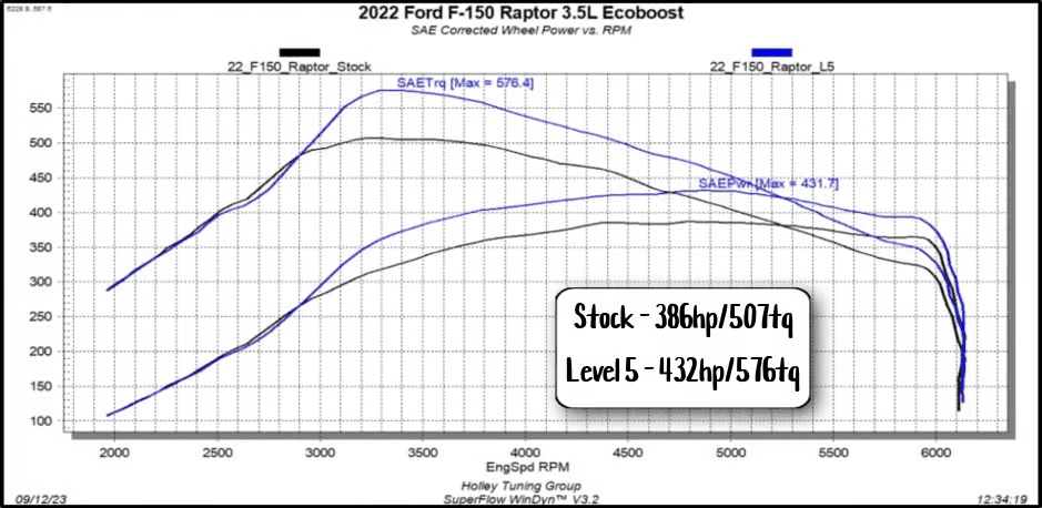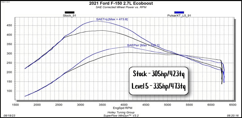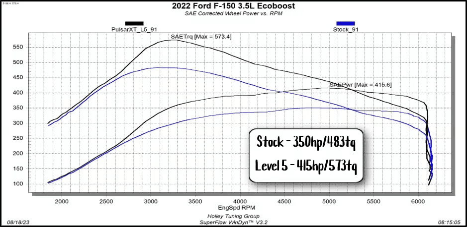 Adds up to 65hp/90tq at peak to 3.5L and 30hp/51tq for 2.7L, 45hp/68tq for Raptor
