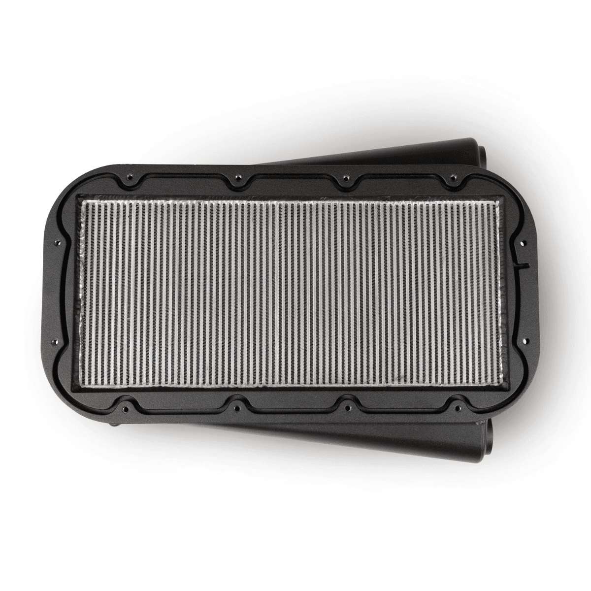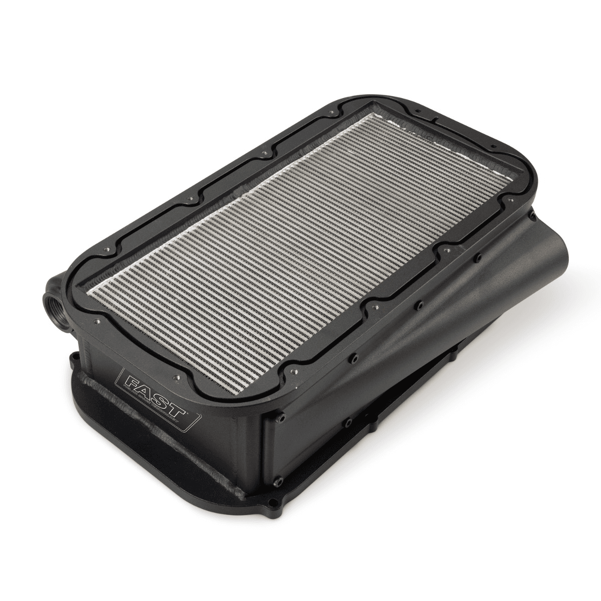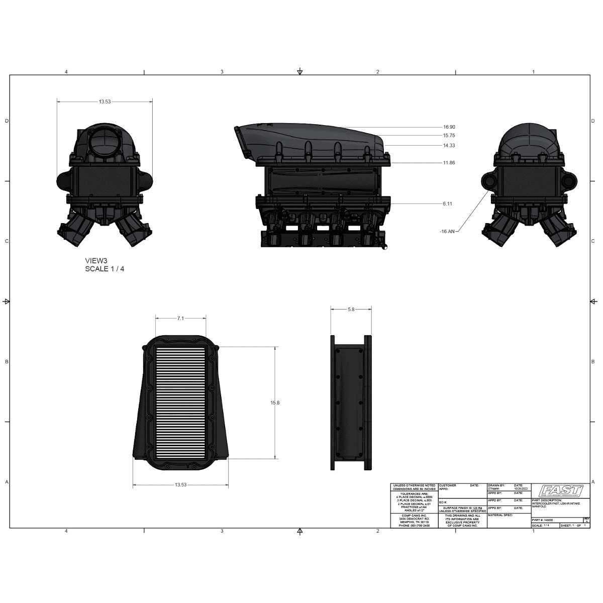 The LSXHR Intercooler is a perfect solution to cool the air charge on a centrifugal-supercharged or turbocharged engine using one of the popular high-ram style intake manifolds such as the FAST LSXHR composite manifold. This air-to-water intercooler conveniently fits between the upper and lower intake manifold, simplifying the installation, while saving space, time, and cost. Testing conducted on a 1,350 HP/20 PSI turbocharged-LSX application showed a 198-degree/F drop in temperature and less than 1psi loss across the intercooler. Rated to 1350HP.