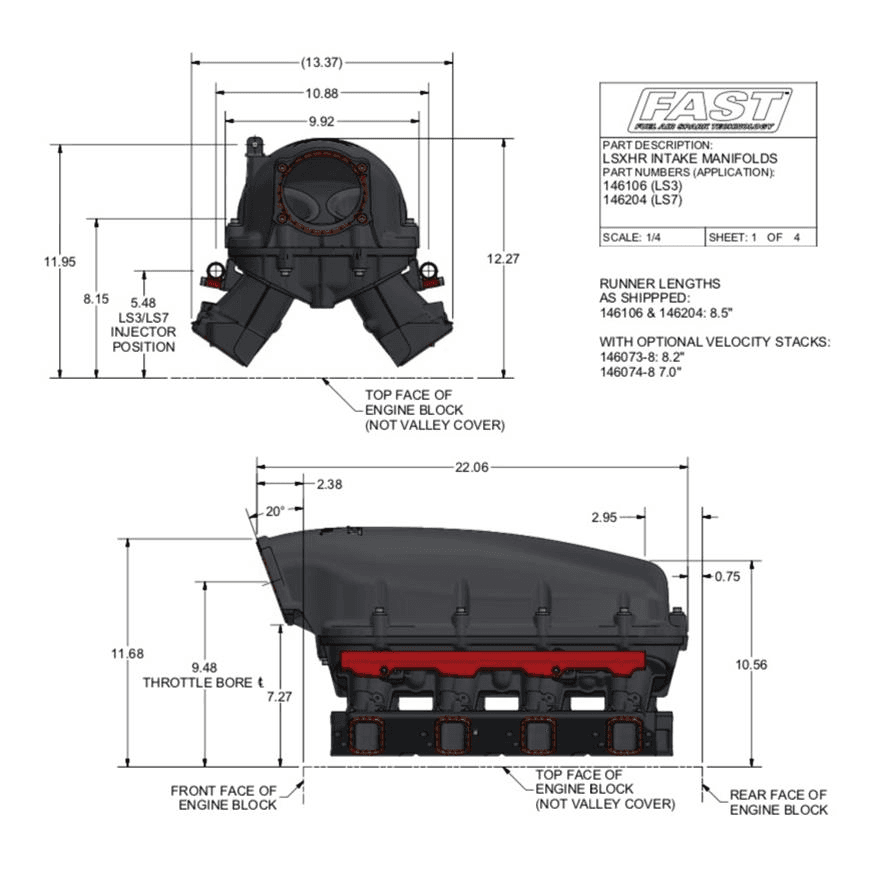 The LSXHR 103mm Intake Manifold for LS7 Raised Rectangular Port Applications is the industry's first polymer tunnel ram-style high ram intake manifold and is ideal for generating maximum power in boosted and naturally aspirated engines. Rated for up to 45psi of continuous pressure. Includes "tall" runner stacks medium and short runner stacks are also available. Average 30 HP gain between 5,000 and 7,500 RPM over competitors' high ram intake manifolds. Reversible top allows for forward- or firewall-facing throttle body installations. Two nitrous nozzle bosses per runner for clean and easy direct port system installations. Compound fuel injector angle aims spray pattern for ideal atomization, resulting in maximum power production and superior drivability.