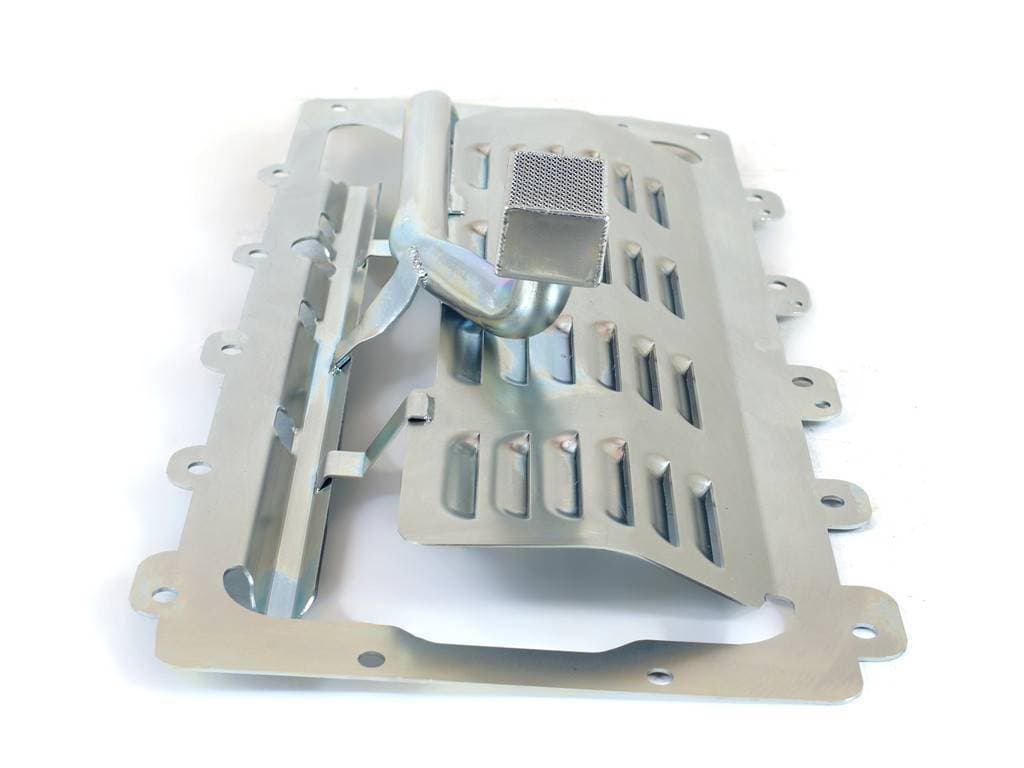 Coyote Gen 3 Louver Tray / Pickup Combo is designed to replace and improve upon Ford part# BR32-6710 when using Canton pan #15-736. The louvered designed tray reduces drag from windage and oil slosh coming off the rotating assembly. This part is tig welded for strength, durability and longevity specifically in high performance applications. The windage tray/pickup combo is required for use with our Gen 3 oil pan 15-736.