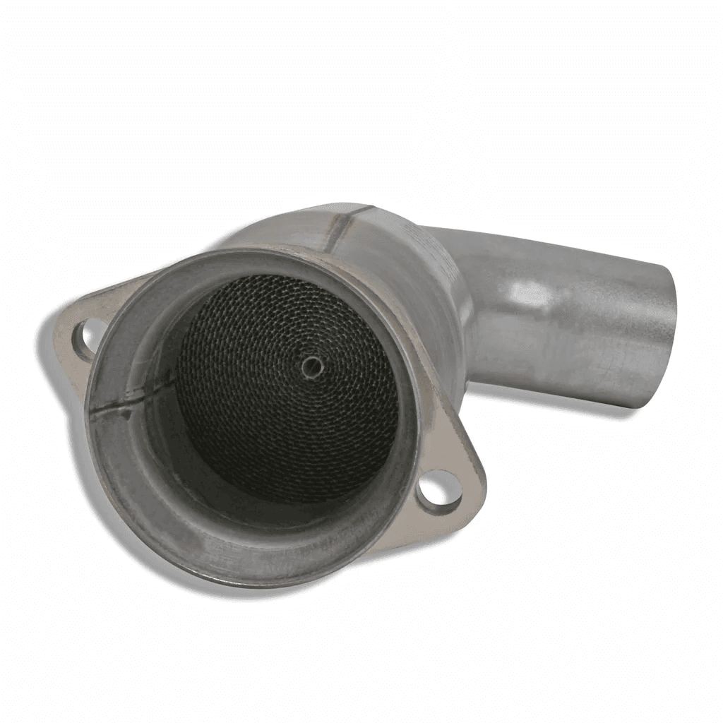 *High flow steel substrate catalytic converters are used for better exhaust flow. This mid-pipe is designed from 3" mandrel bent stainless steel for great exhaust flow.