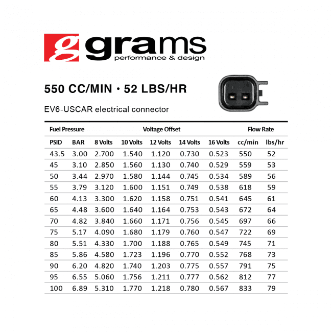 Each injector set includes dead time compensation values to help ensure consistent air/fuel ratios and optimal performance when tuning. Grams Performance Fuel Injectors are carefully tested and matched in controlled laboratory environments using state-of-the-art equipment and are subjected to rigorous dyno, street, and race track testing to ensure proper performance in the most extreme conditions.