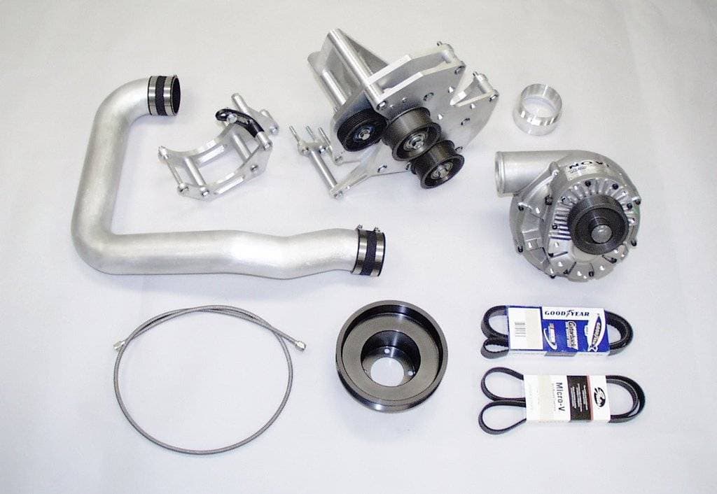 Supercharger drive system includes the necessary belts, and pulleys, and belt tensioner