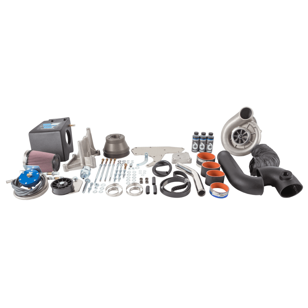 - Complete bolt-on system including all necessary belts, pulleys and reusable high-flow air filter.