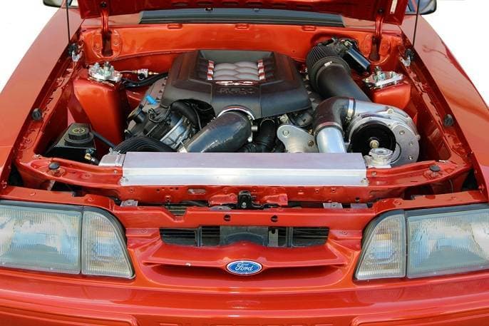 ProCharger has been meticulously working on their own transplant kit for some time now. Long time ProCharger employee Clint Rucker graciously offered up his Coyote powered LX for R&D. This Fox features plenty of go-fast goodies including a D-1SC ProCharger, BBK headers, Magnaflow exhaust, a T-56 Transmission and 3.73 gears in the rear end. This array of parts is good for 10 psi of intercooled boost and has turned the rollers at 700 wheel horsepower and 504 foot pounds of torque. These are substantial power numbers while also taking into account the vehicles’ modest 2750 pound curb weight. Once again ProCharger expands its Fox body product lineup with a Coyote transplant bracket assembly option, providing a clean installation and mounting position that accounts for the reduced hood clearance on the Fox body Mustangs. This system will swap into any application!