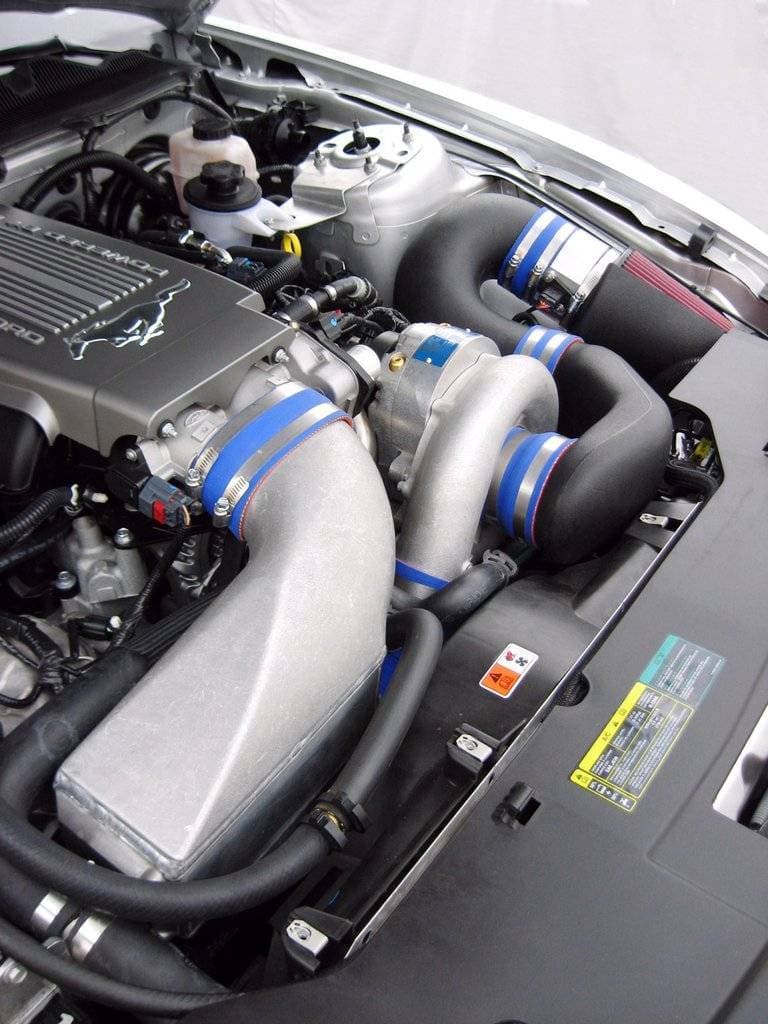 This Mustang supercharger system uses Vortech's V-3 Si supercharger. The "i" in Si stands for improved and with its new patented oil control system and state of the art centrifugal compressor stage this V-3 literally blows away the competition. This compressor has an industry-leading 78% adiabatic efficiency, which means less heat is being generated, drive power is reduced and more net power is produced. Less heat also means better durability. Even better, Vortech supercharger systems weigh half as much (or less) than competing roots type supercharger brands. Vortech supercharger systems are a great value. Dollar for dollar, Vortech systems deliver more horsepower than virtually any other method of upgrade. Also, driven normally, gas mileage often increases rather than decreases.