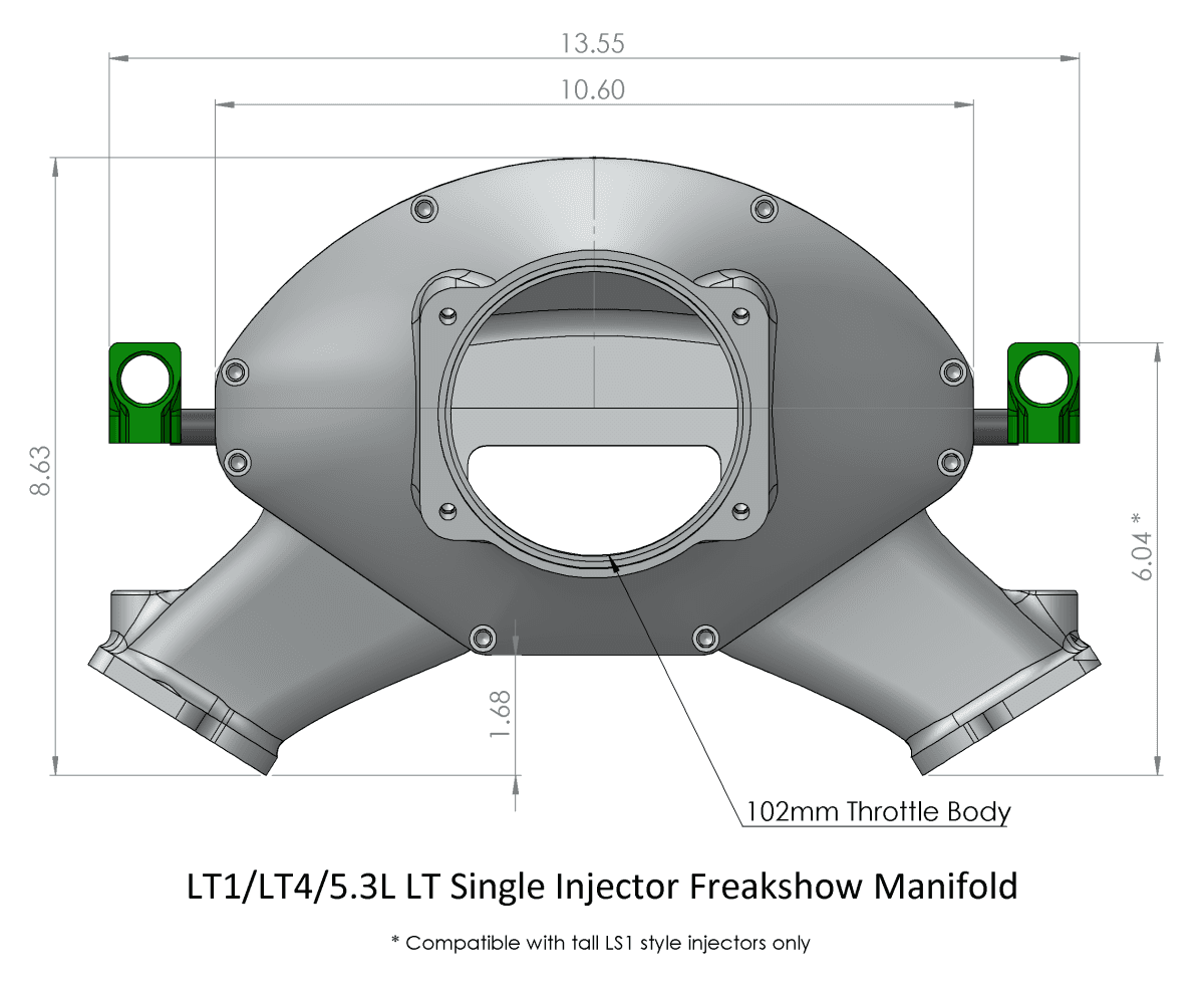 Freakshow intake manifold is inspired by the hottest NHRA Pro Stock designs. FED engineers gave it a sick meticulous design and added a raging plenum volume capable of 2,000 HP. The 100% billet aluminum Freakshow is built with a lot of options and versatility to serve naturally aspirated, Nitrous or remote inter-cooled boost applications.