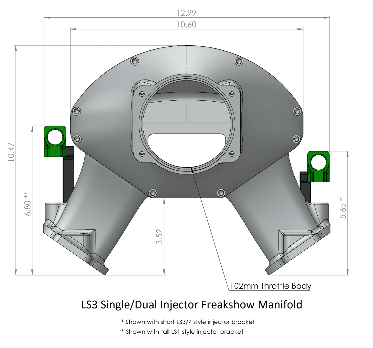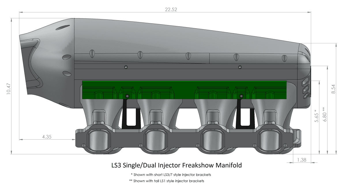 Freakshow intake manifold is inspired by the hottest NHRA Pro Stock designs. FED engineers gave it a sick meticulous design and added a raging plenum volume capable of 2,000 HP. The 100% billet aluminum Freakshow is built with a lot of options and versatility to serve naturally aspirated, Nitrous or remote inter-cooled boost applications.