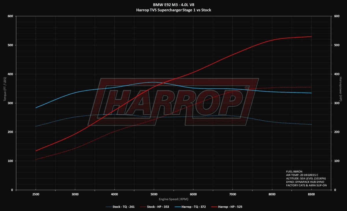 525 hp and 372 ft-lbs (+175hp / +111 ft-lbs gain over stock)
