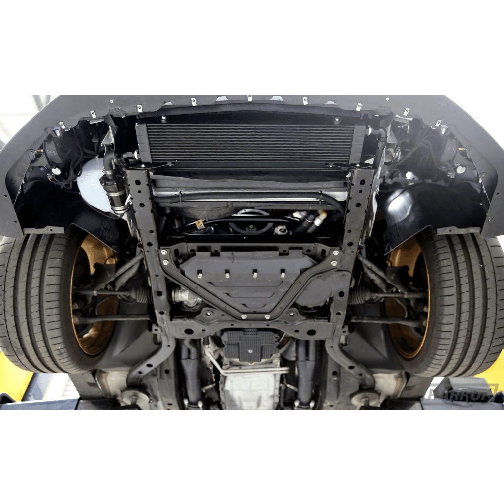 Our Oil Cooler Kit was designed to be a robust solution, entirely removing the factory water to oil system that has a risk of failure and potential to cause engine damage without warning. The oil cooler is mounted flat in front of the radiator just above the undertray, receiving cool air from the lower air intake and forms part of the ram air pressure zone. This location is optimal to prevent hot air off the Oil Cooler decreasing the efficiencies of the Supercharger front mount Intercooler if fitted, AC Condenser and Radiator. The Harrop Ford Mustang GT Engine Oil Cooler is highly efficient and race proven to keep engine oil temperatures low under high load for either street or track work.
