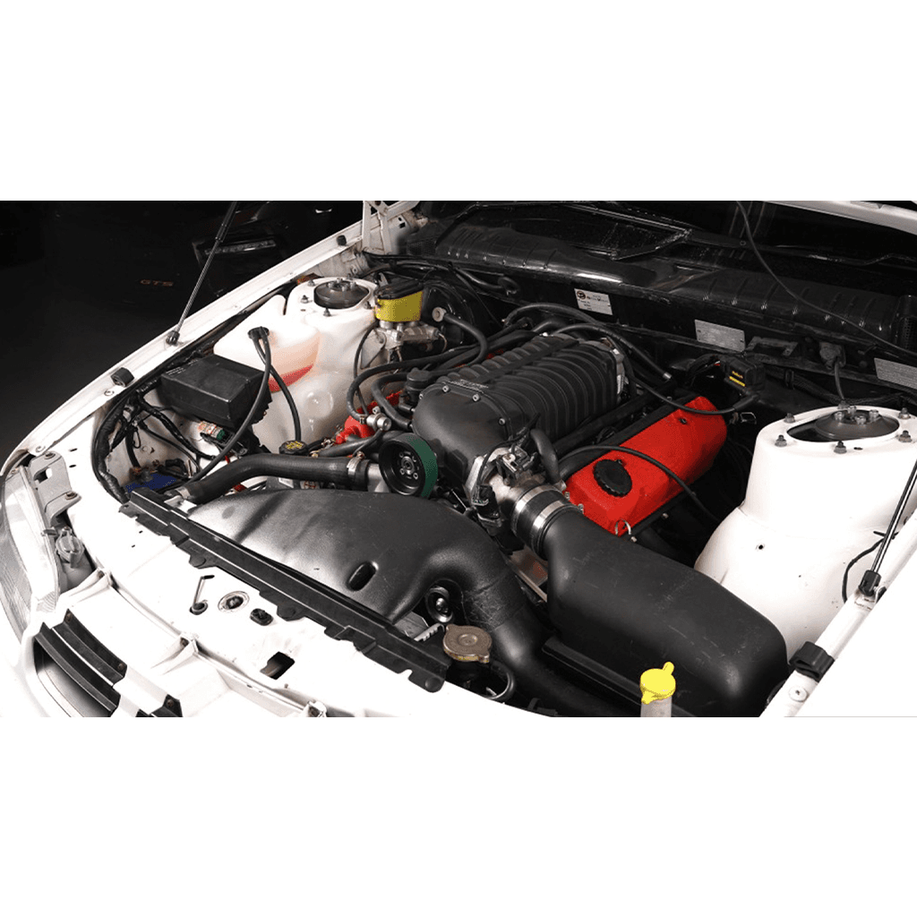 This non-intercooled kit is designed to fit under the stock OE Holden bonnet on Holden VP-VS Commodores with the 5L V8 Engine and integrates with the factory airbox, fuel pressure regulator and throttle body. This system only includes the Harrop tvs2300 supercharger and manifold, 2.7bar map sensor, fuel rails, idler bracket with automatic tensioner, 8-rib crank pulley, 8-rib alternator pulley, 8-rib water pump pulley (will work with long or shot water pumps), 8-rib supercharger belt and 90mm/3.54" supercharger pulley.