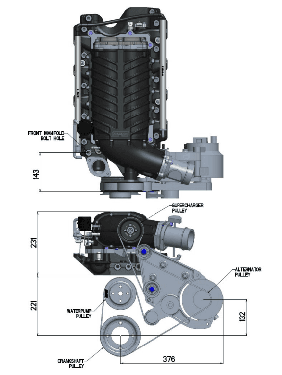 Building on our existing Holden 5.0L V8 Supercharger program, our engineers have developed a non-intercooled, low profile TVS2300 Supercharger for improved bonnet clearance. The front drive / front inlet design allows for a shorter less restrictive intake path allowing for improved airflow and superior performance with an integrated Supercharger Bypass System to relieve boost under light load conditions. Only for EFI heads will not work with early Holden 5.0L engines. Requires a custom tune done locally after you install the kit. The Harrop TVS2300 Supercharger is capable of producing 800hp with further supporting modifications.